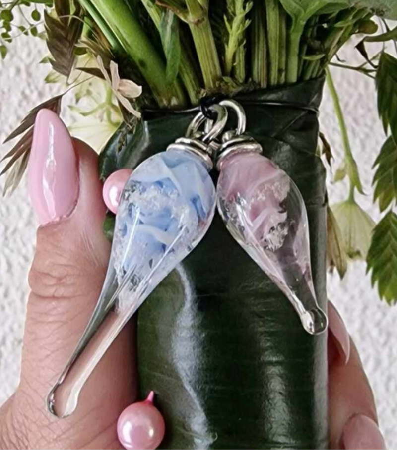Geboorte: tandje, plukje haar en moedermelk tussen de lagen glas in.