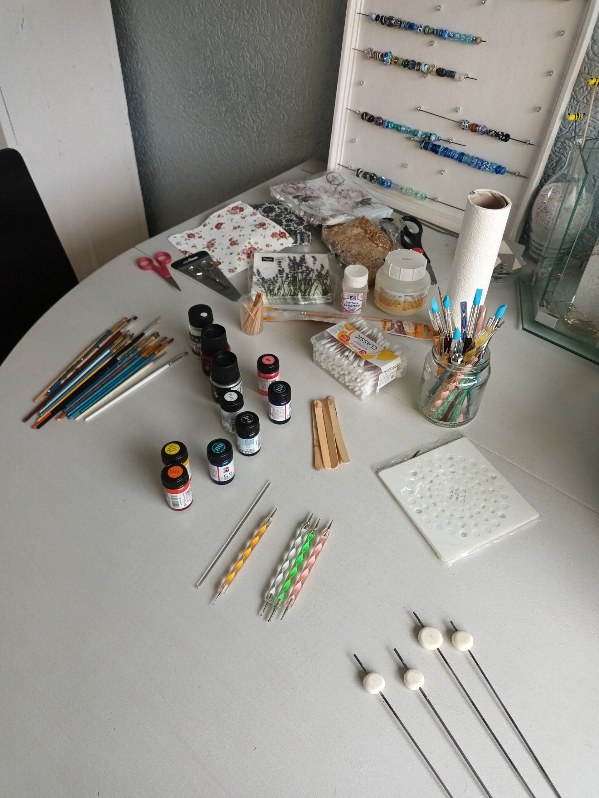 Je gaat je eigen glas kraal ontwerpen, met glasverf en of decoupage van servetten.